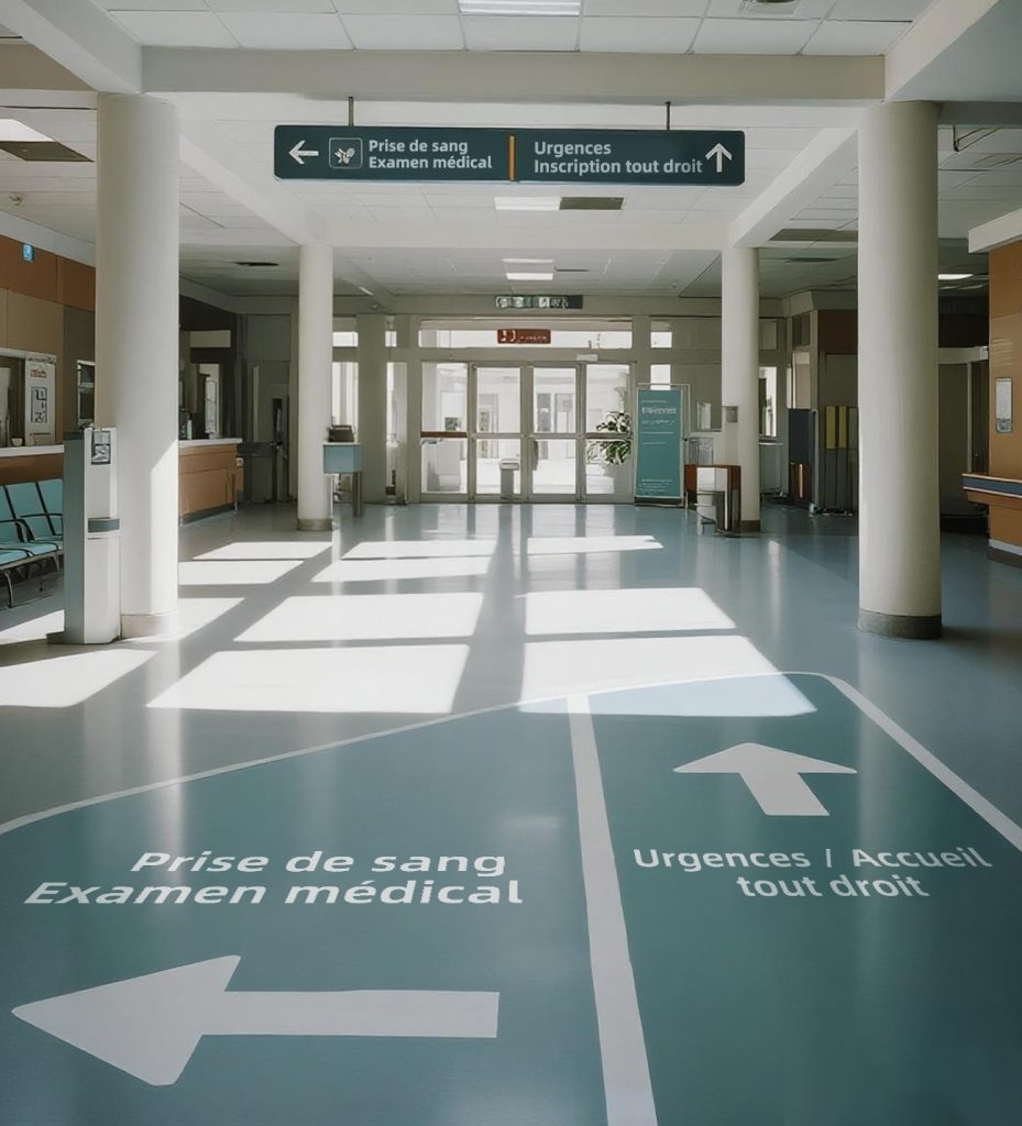Stickers such as “Prise de sang / Examen médical” and “Urgences / Accueil” with arrows directed patients to key destinations.