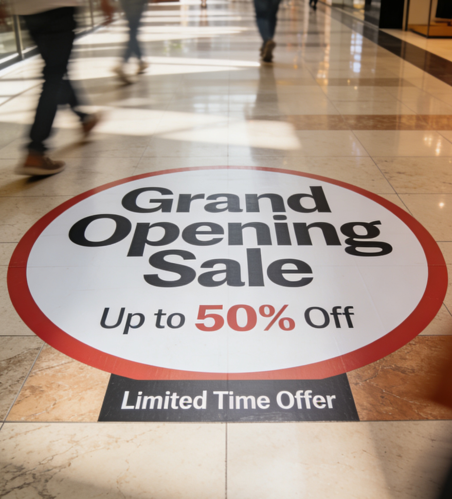 New Store Opening Scenario: “Grand Opening Sale” stickers were laid in surrounding corridors and intersections near the target store, with a striking red outer ring to ensure customers did not miss the new location amid the complex store layout.