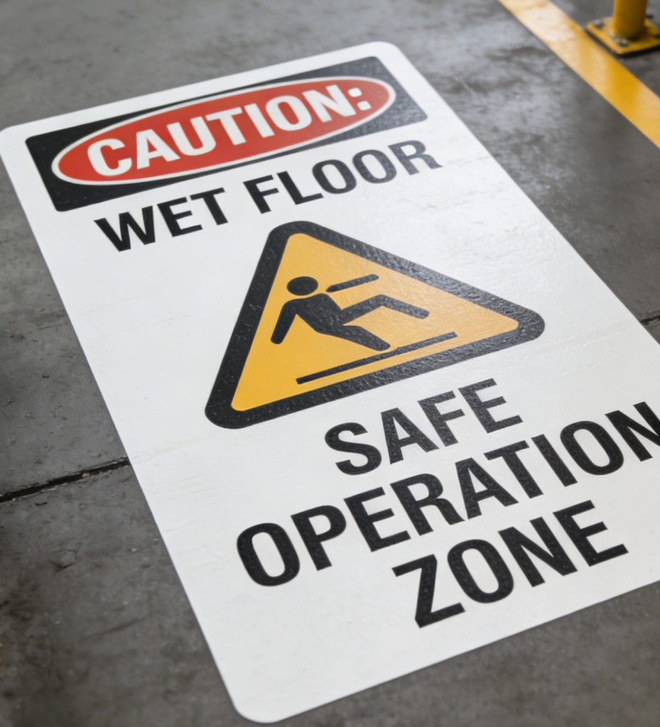 Wet Floor Warnings: Red “CAUTION” headers paired with yellow slip-hazard triangles clearly mark “WET FLOOR” areas, alerting workers to immediate slip risks.