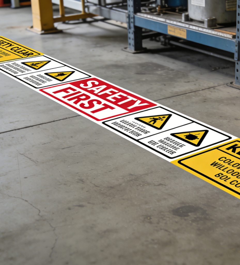 Continuous “SAFETY FIRST” strips along walkways and around machinery create a visual safety perimeter, guiding workers away from high-risk areas.