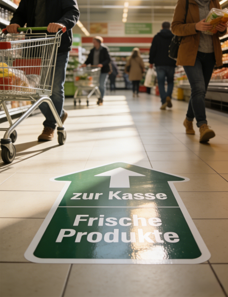 Fresh Produce & Checkout: A prominent green arrow-shaped sticker directs customers “zur Kasse (to checkout)” and highlights “Frische Produkte (Fresh Products),” guiding them to high-priority zones while reinforcing the store’s focus on quality.