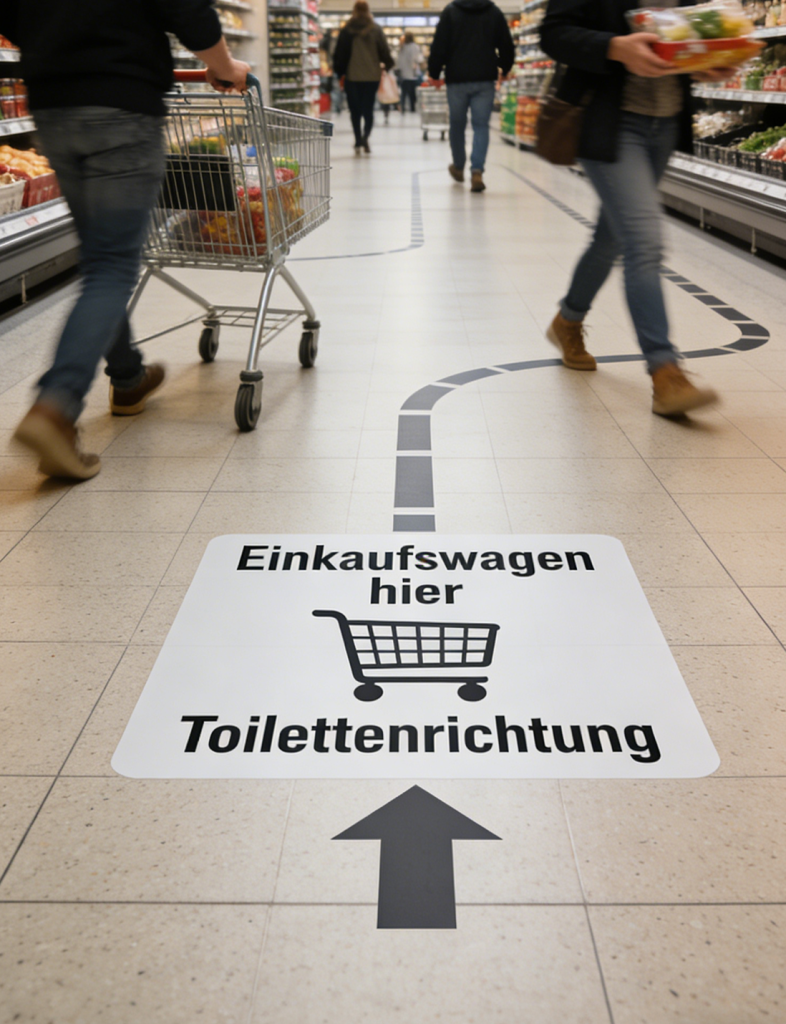 Trolley & Restroom Guidance: A white rectangular sticker with a trolley icon clearly marks “Einkaufswagen hier (Trolleys here)” and “Toilettenrichtung (Restroom direction),” with a grey arrow to maintain visual hierarchy.
