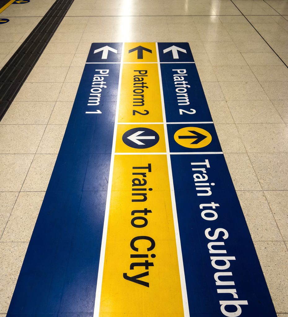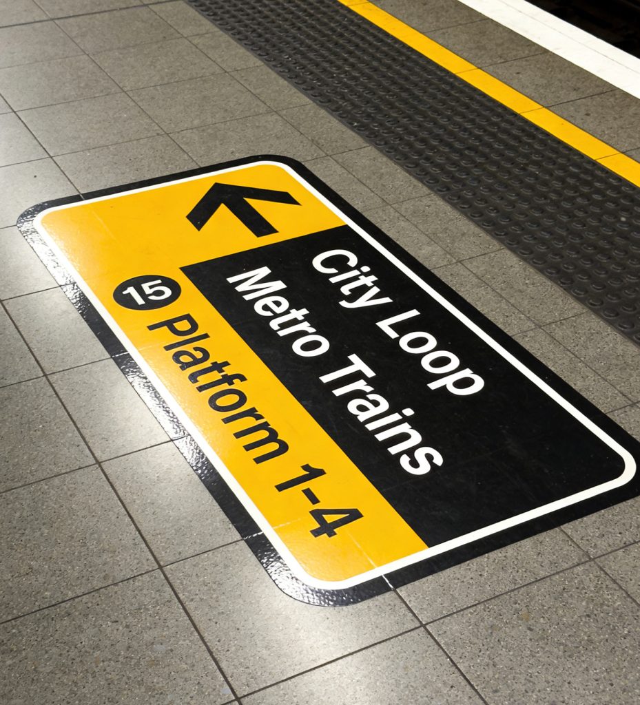 As the core commuting hub of Australian cities, metro systems carry hundreds of thousands of passengers daily. The complex multi-platform layout and frequent train schedules can easily lead to passenger confusion and travel delays. The core goal of this project was to create a seamless commuting experience by translating spatial information into clear, ground-level visual cues. We delivered a customized wayfinding floor sticker solution tailored to the metro hub:
